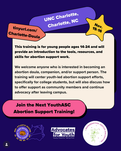 This training is for young people ages 14-24 and will provide an introduction to the tools, resources, and skills for abortion support work. We welcome anyone who is interested in becoming an abortion doula, companion, and/or support person. The training will center youth-led abortion support efforts, specifically for high school and college students, but we will also discuss how to offer support as community members and continue advocacy after leaving campus. Dopo* defines an Abortion Doula as “Anyone that can physically, emotionally, and/or spiritually hold space for someone before, during, and/or after abortion.” We will explore different forms of practical support that may show up in clinical and non-clinical contexts, providing support for procedural and medical abortions, and how to organize your campus community to create support networks.